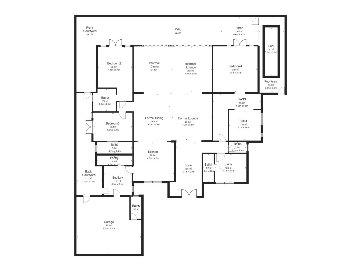 Designed with flow and spaciousness in mind, the open-plan living areas transition seamlessly into a sun-drenched family room featuring a second lounge, dining area, and a fully equipped stylish full bar. The kitchen is sleek, functional, and beautifully designed — perfect for both casual meals and gourmet entertaining — and is complemented by a large scullery for added convenience.