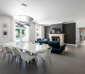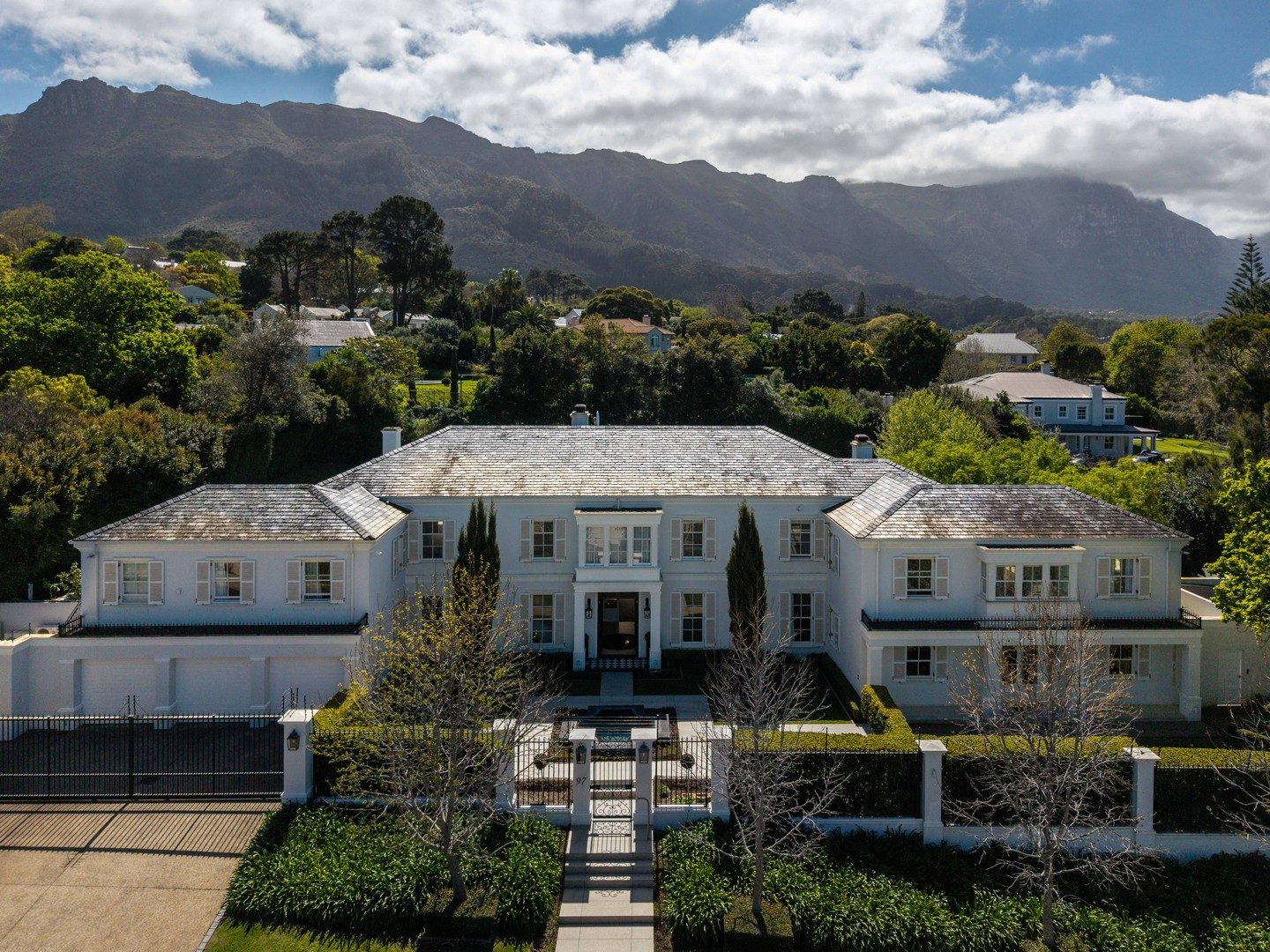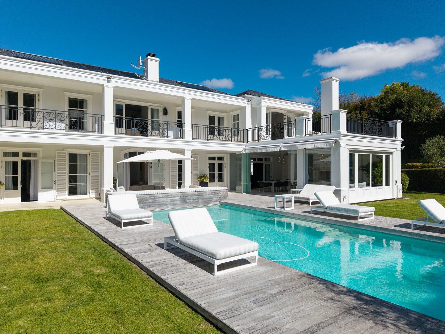 Tucked away in one of Constantia’s most sought-after avenues, this elegant Georgian-inspired residence combines timeless character with modern family comfort. A welcoming courtyard and fountain set the tone as you step inside, where a grand entrance hall with sweeping staircase creates an immediate sense of arrival. The home offers eight spacious bedrooms and five-and-a-half bathrooms, including a luxurious main suite with dual dressing rooms, a private balcony, and serene mountain views. Multiple living areas provide space for both relaxation and entertaining, from the open-plan kitchen and dining area with premium appliances and a wood-burning fireplace, to a study, music room, and children’s playroom. Expansive glass doors open seamlessly to a sheltered patio with built-in braai, landscaped gardens, and a sparkling solar-heated swimming pool with wooden deck.