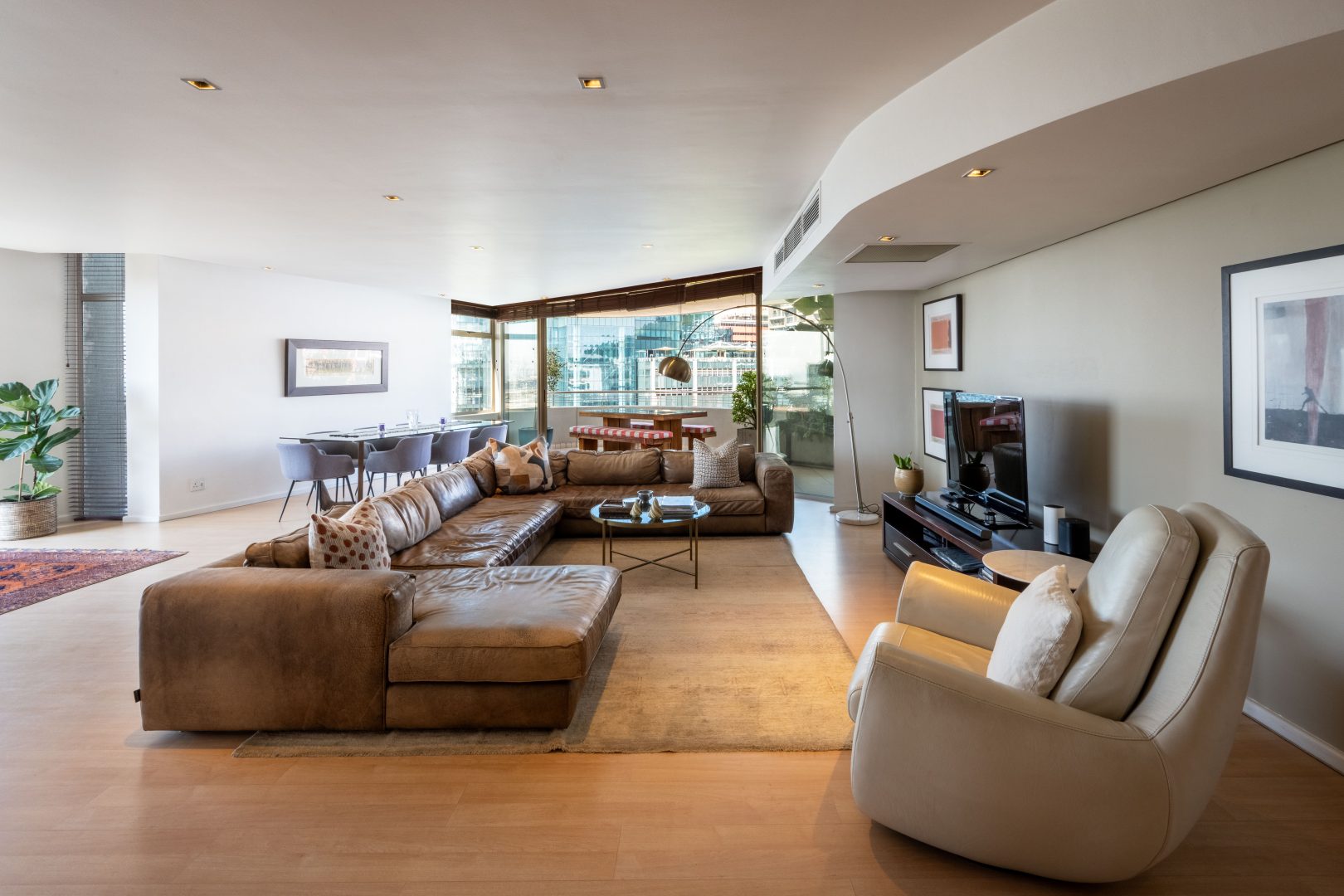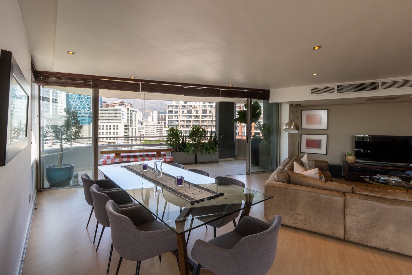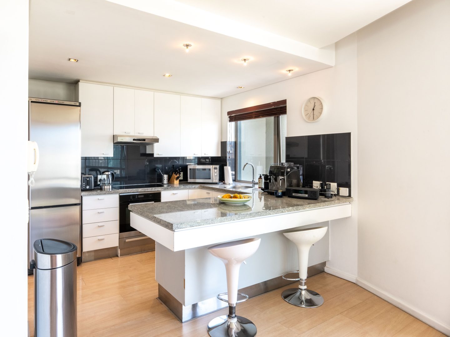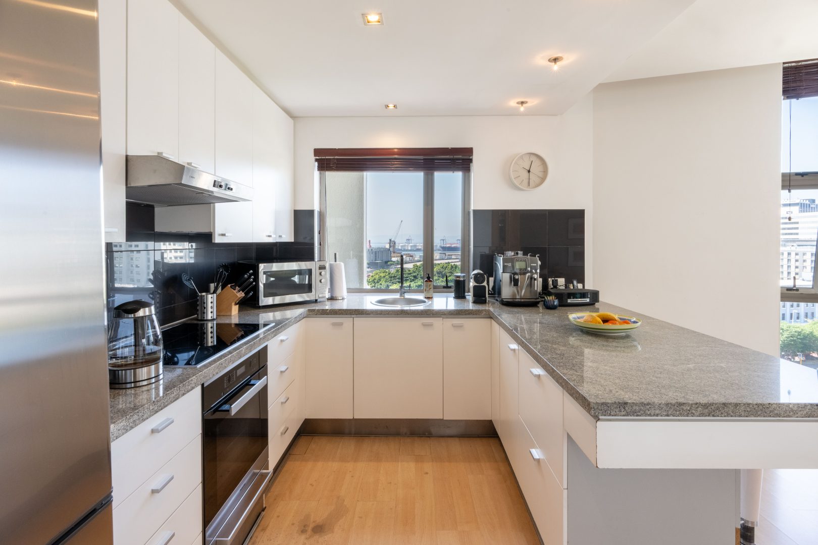 The open-plan dining and living area features large windows overlooking the harbour. Sliding doors open onto a generous balcony, perfect for enjoying city views with Table Mountain as the backdrop.