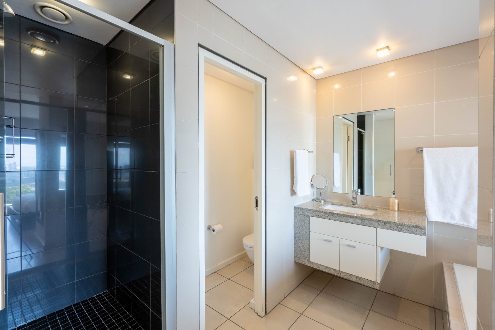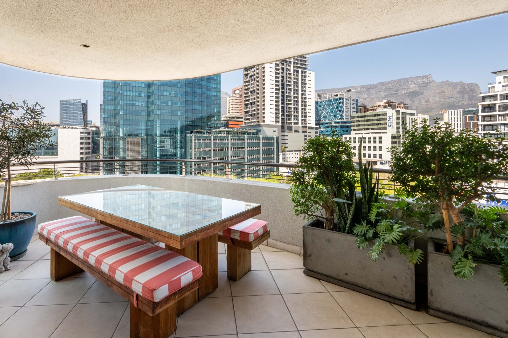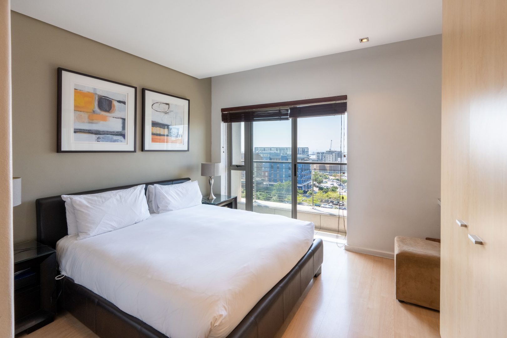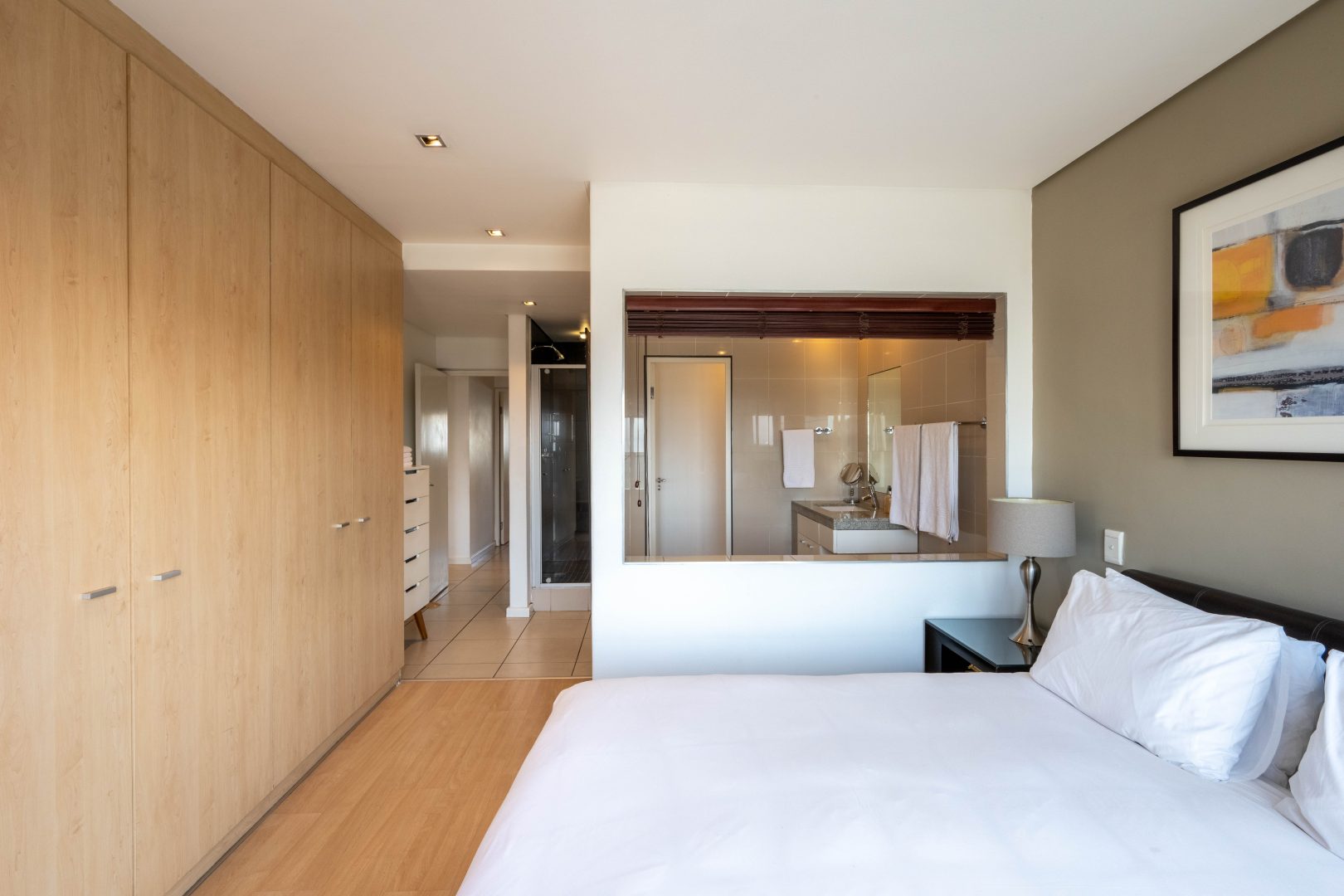 The main bedroom includes an en-suite bathroom with a bath overlooking the harbour, a separate shower, and balcony access. The second bedroom enjoys striking views of Signal Hill, the tip of Lion’s Head, and glimpses of Table Mountain framed between adjacent buildings.