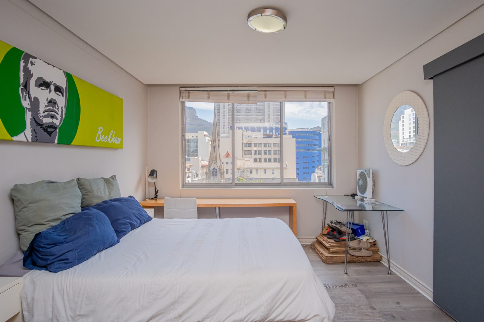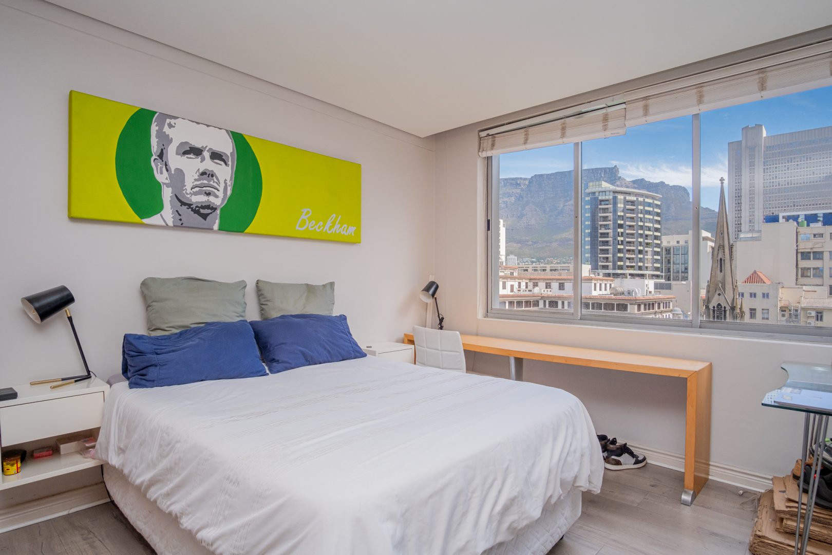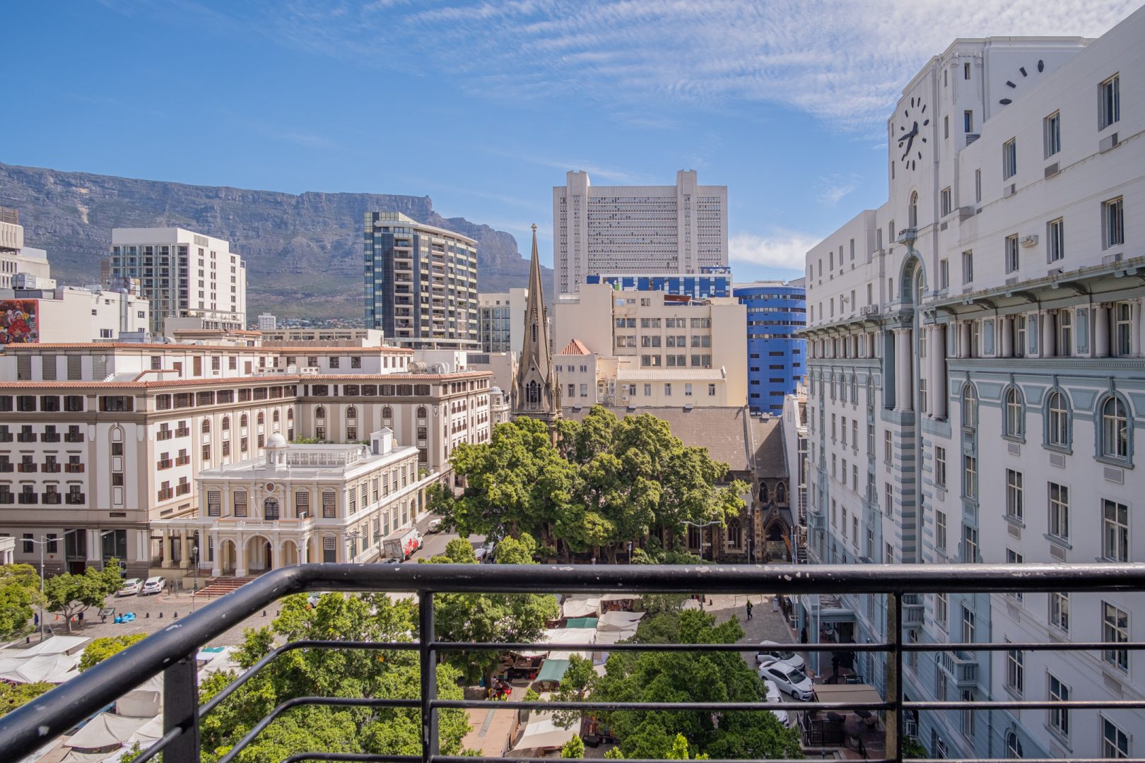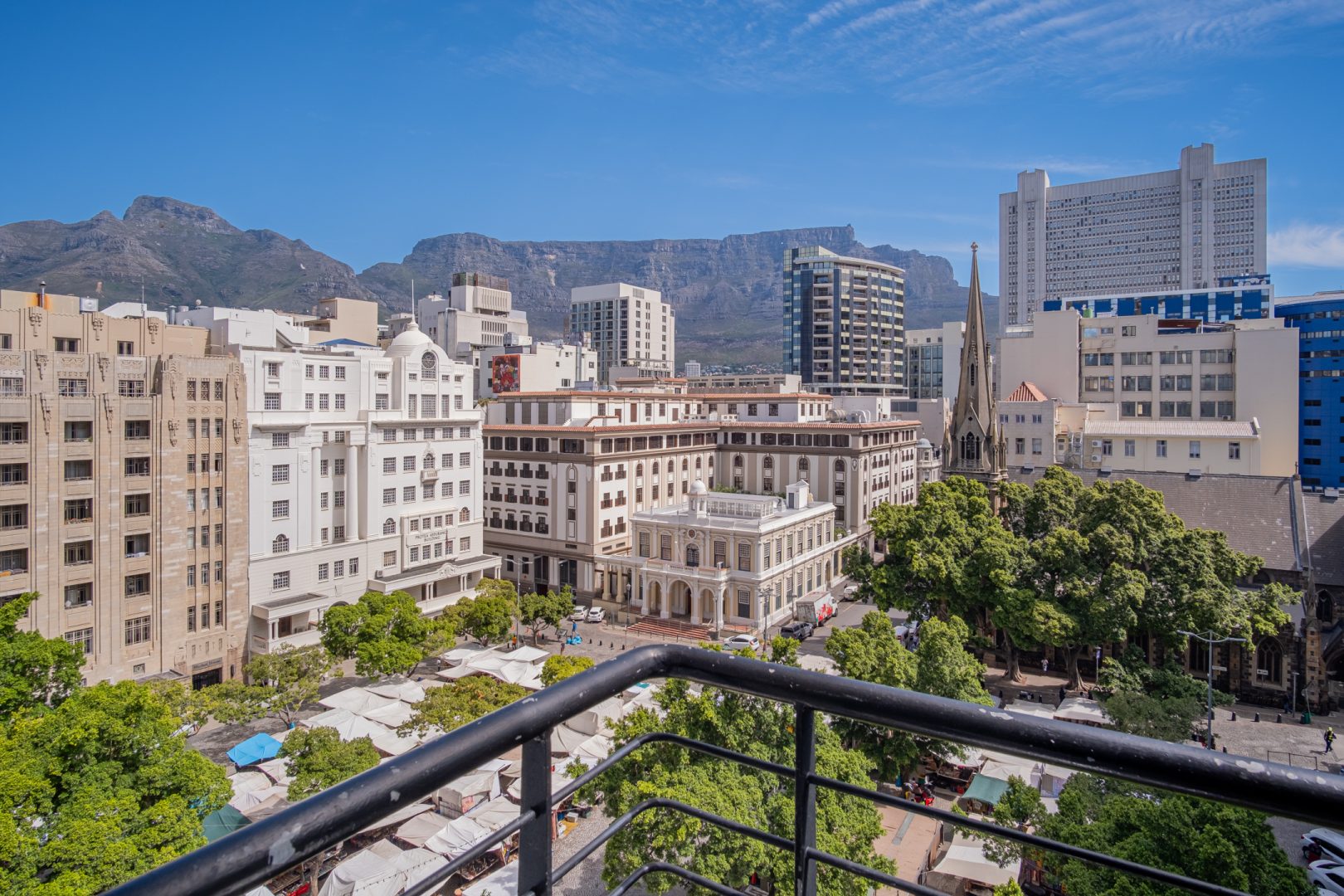 Vinyl flooring adds a warm touch to each bedroom, while the open-plan living area with tiled flooring flows onto a private balcony overlooking Greenmarket Square, a historic church, and the striking Table Mountain.