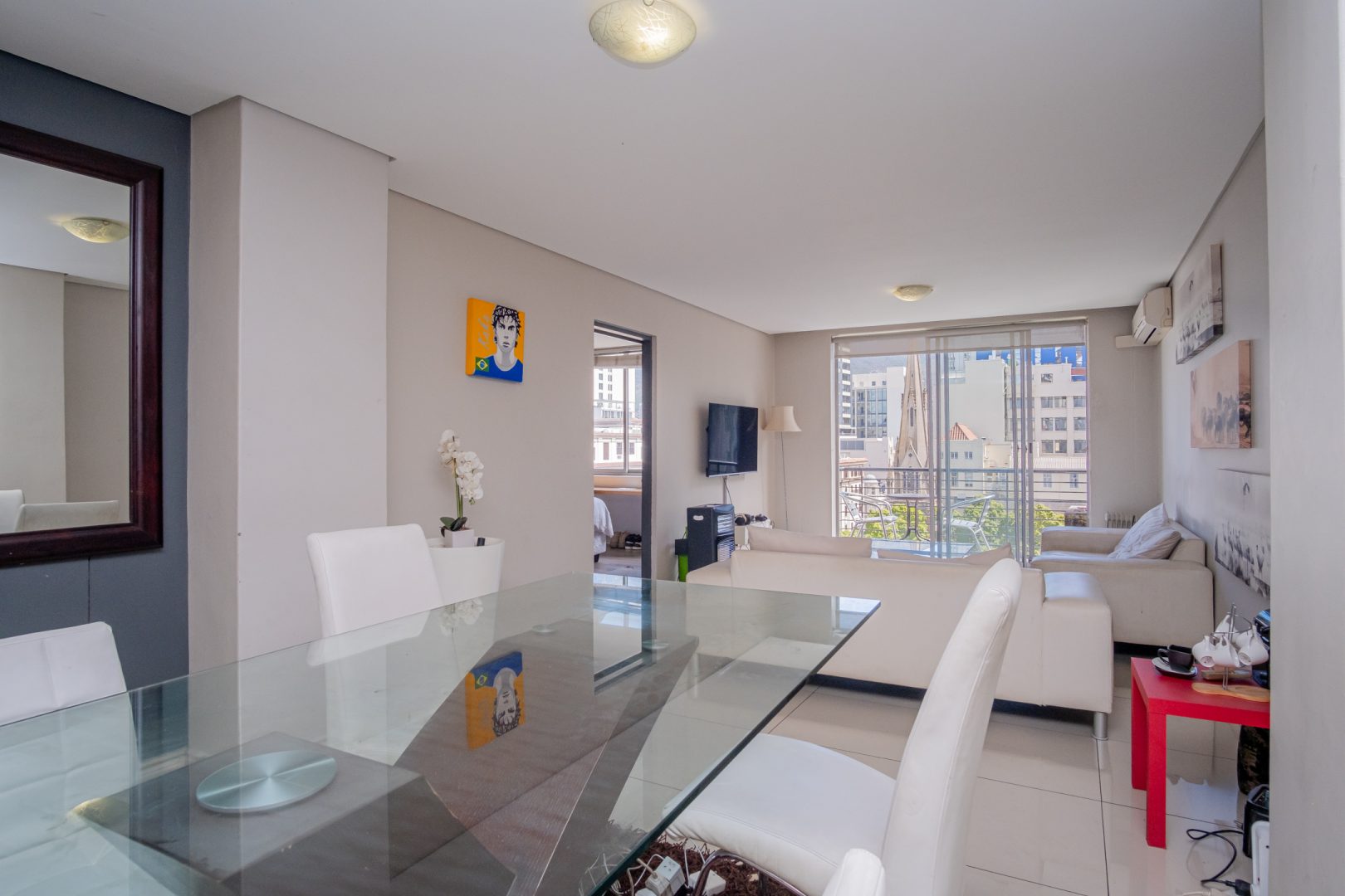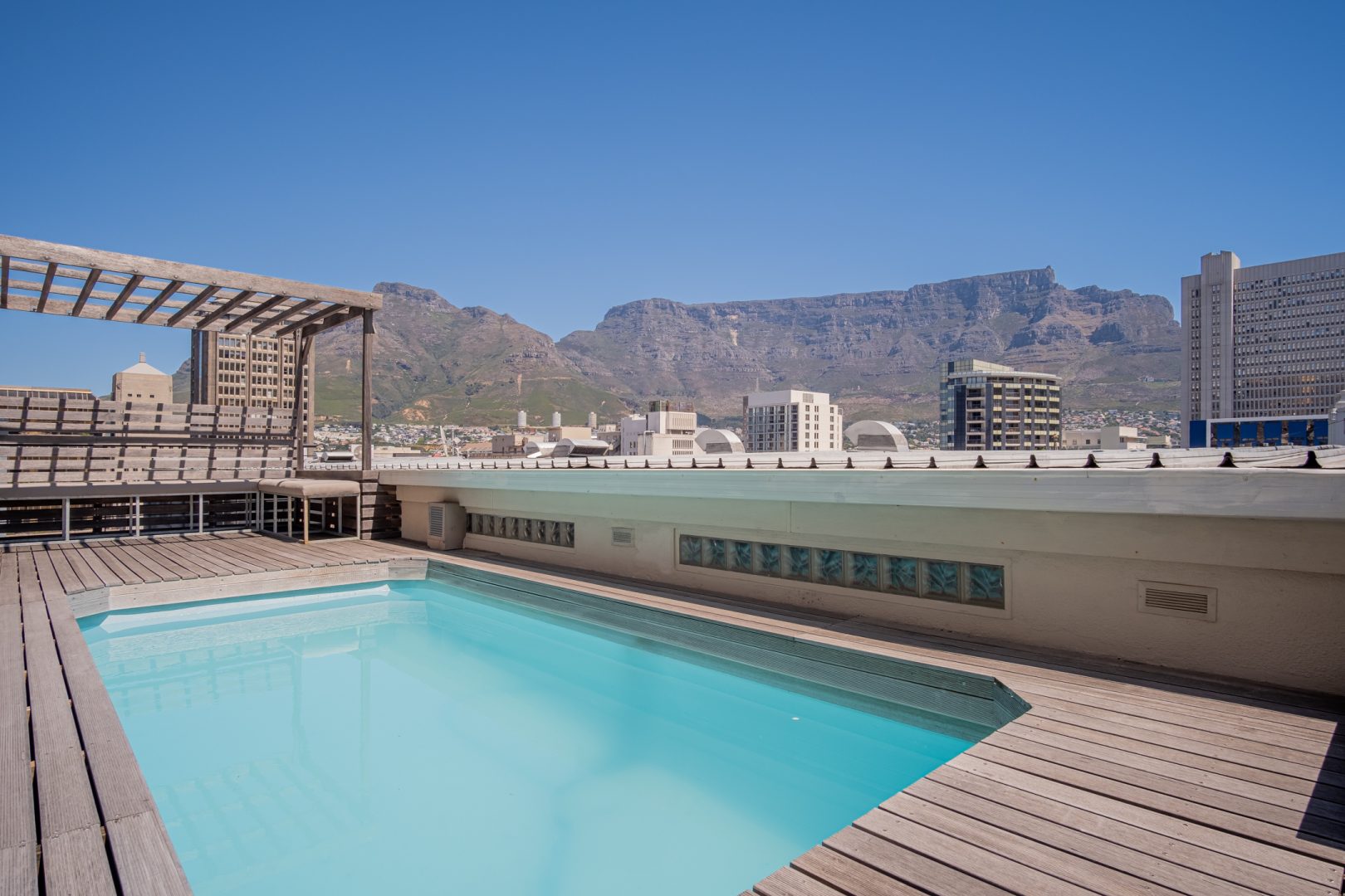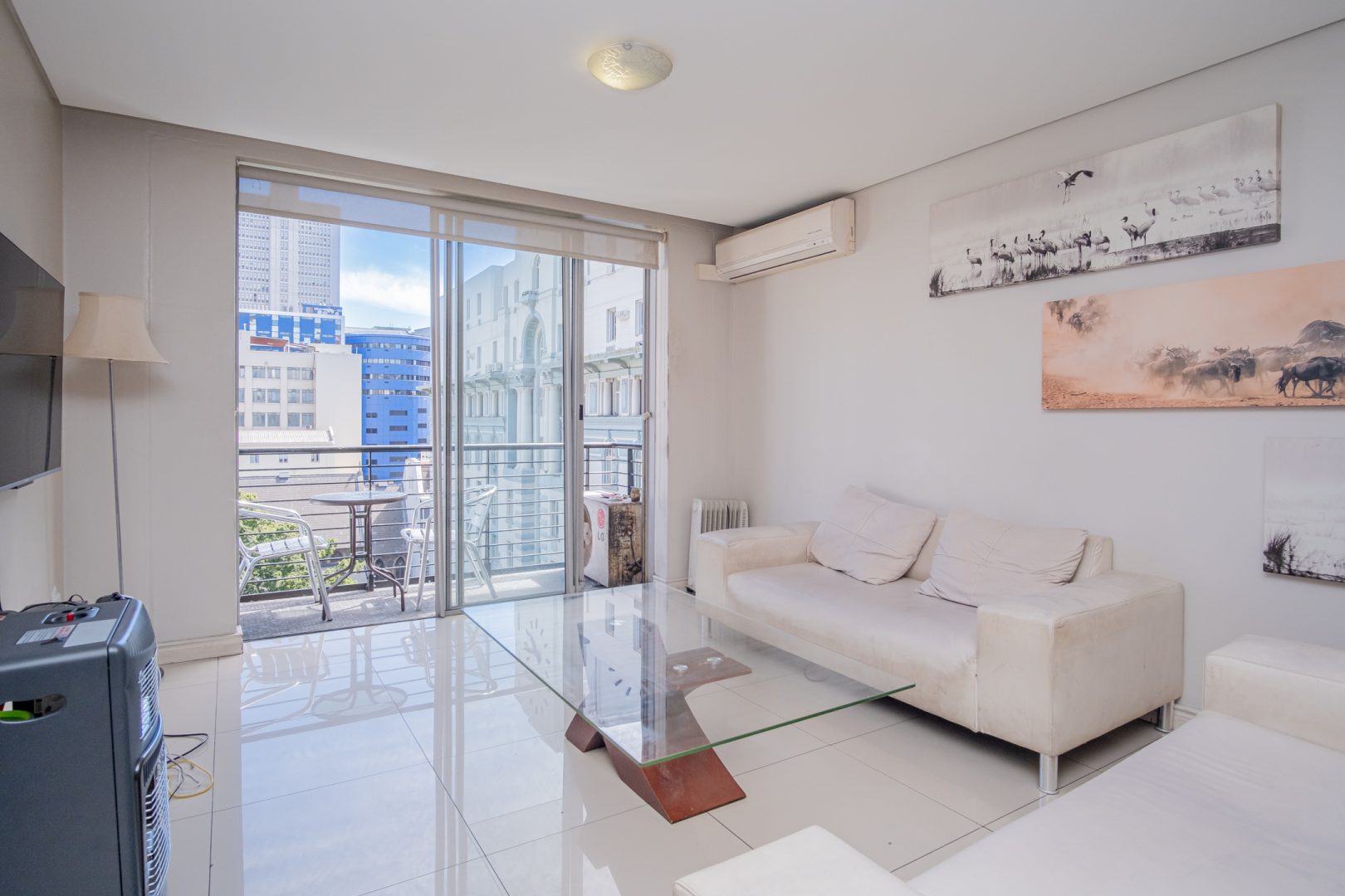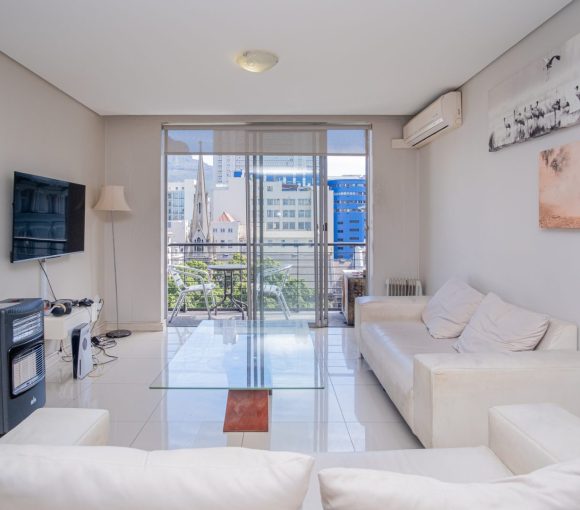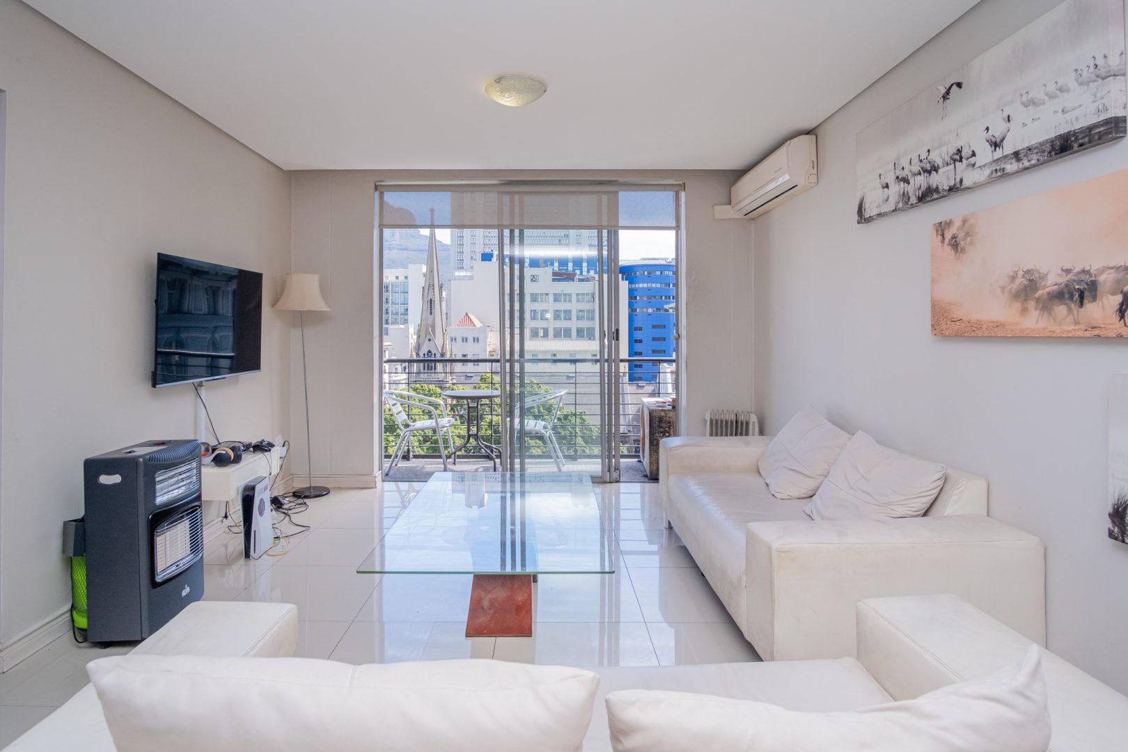 Vinyl flooring adds a warm touch to each bedroom, while the open-plan living area with tiled flooring flows onto a private balcony overlooking Greenmarket Square, a historic church, and the striking Table Mountain.