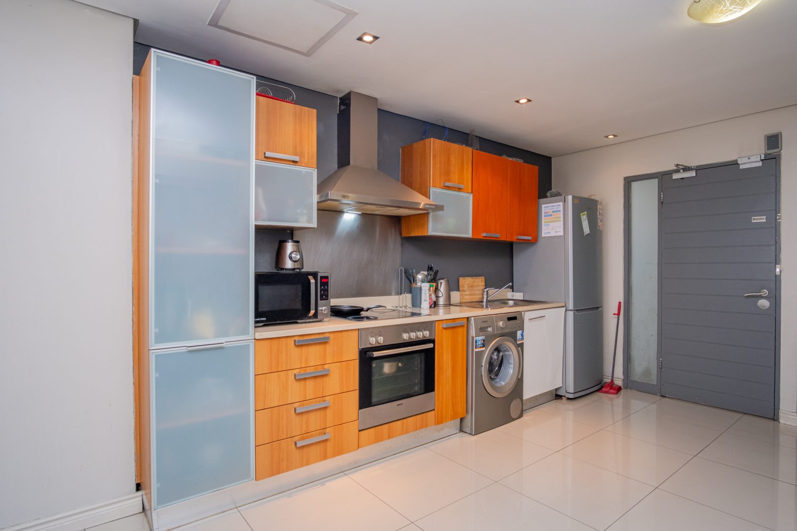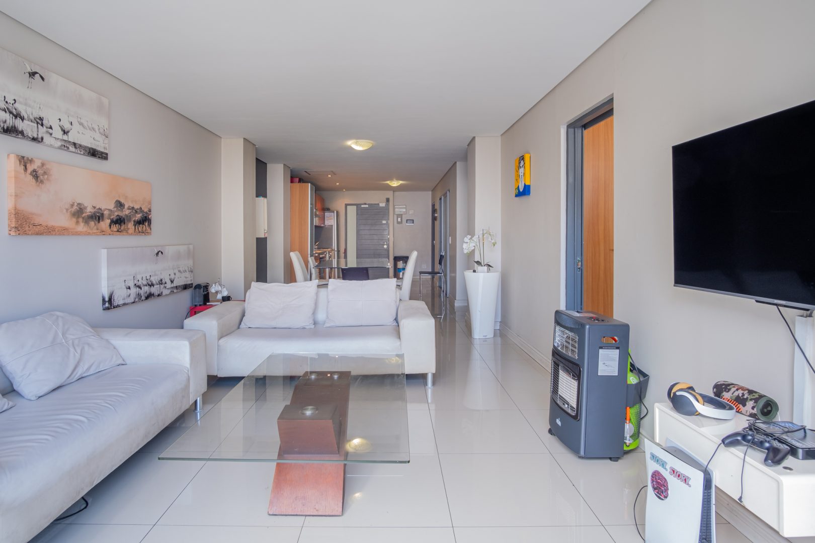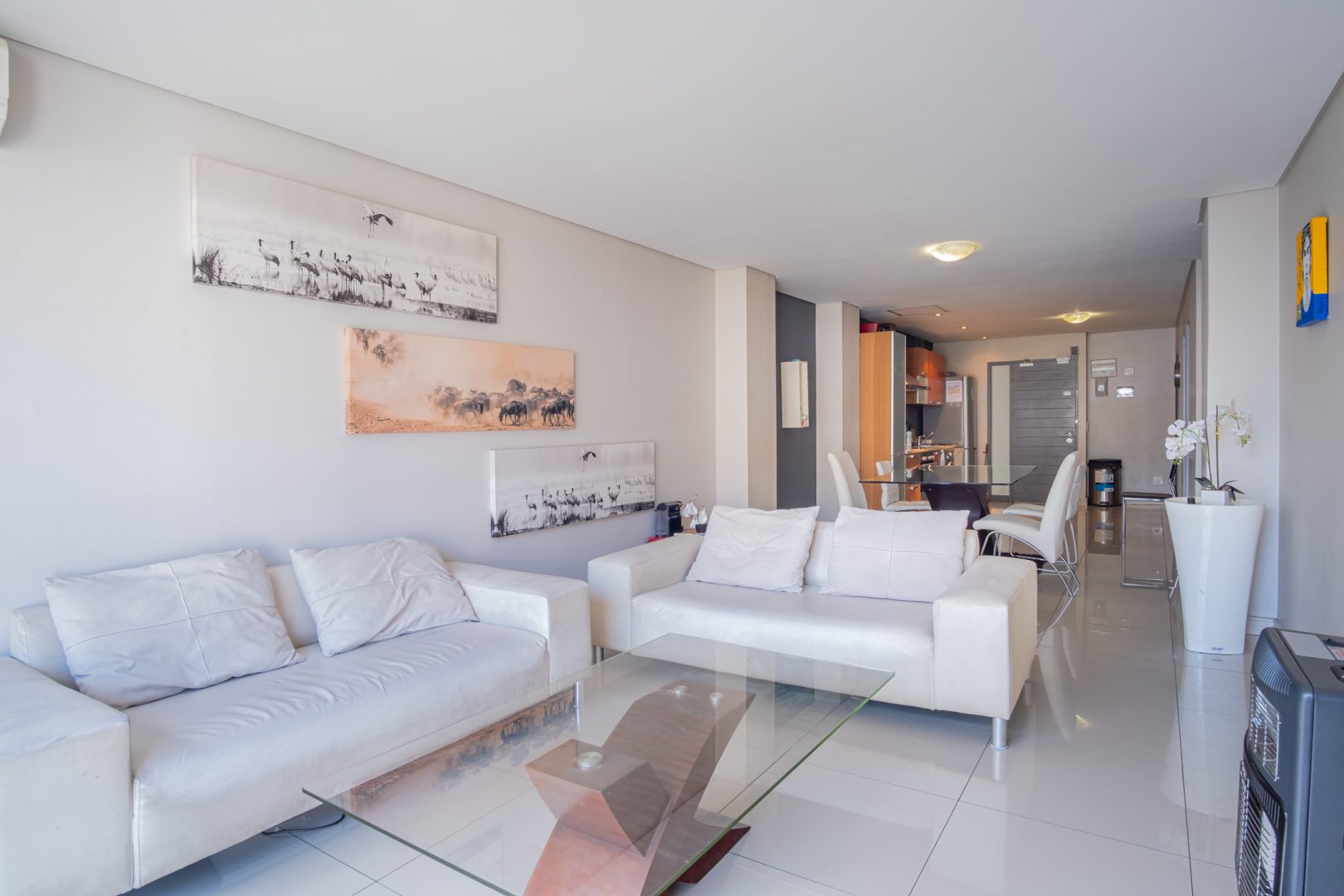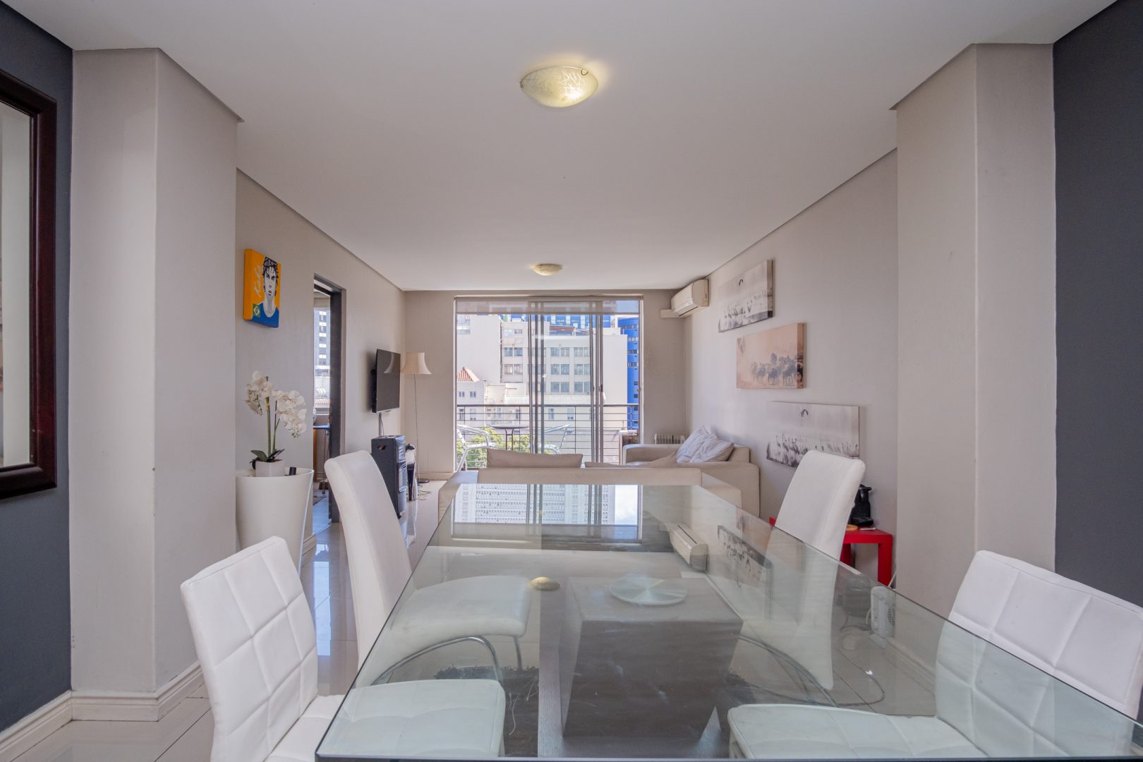 Vinyl flooring adds a warm touch to each bedroom, while the open-plan living area with tiled flooring flows onto a private balcony overlooking Greenmarket Square, a historic church, and the striking Table Mountain.